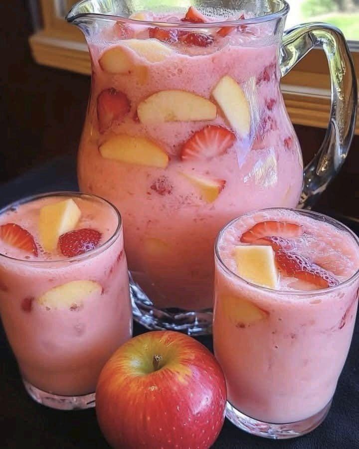 Meet the Creamy Strawberry Apple Punch — a luscious, pastel-pink beverage that blends: