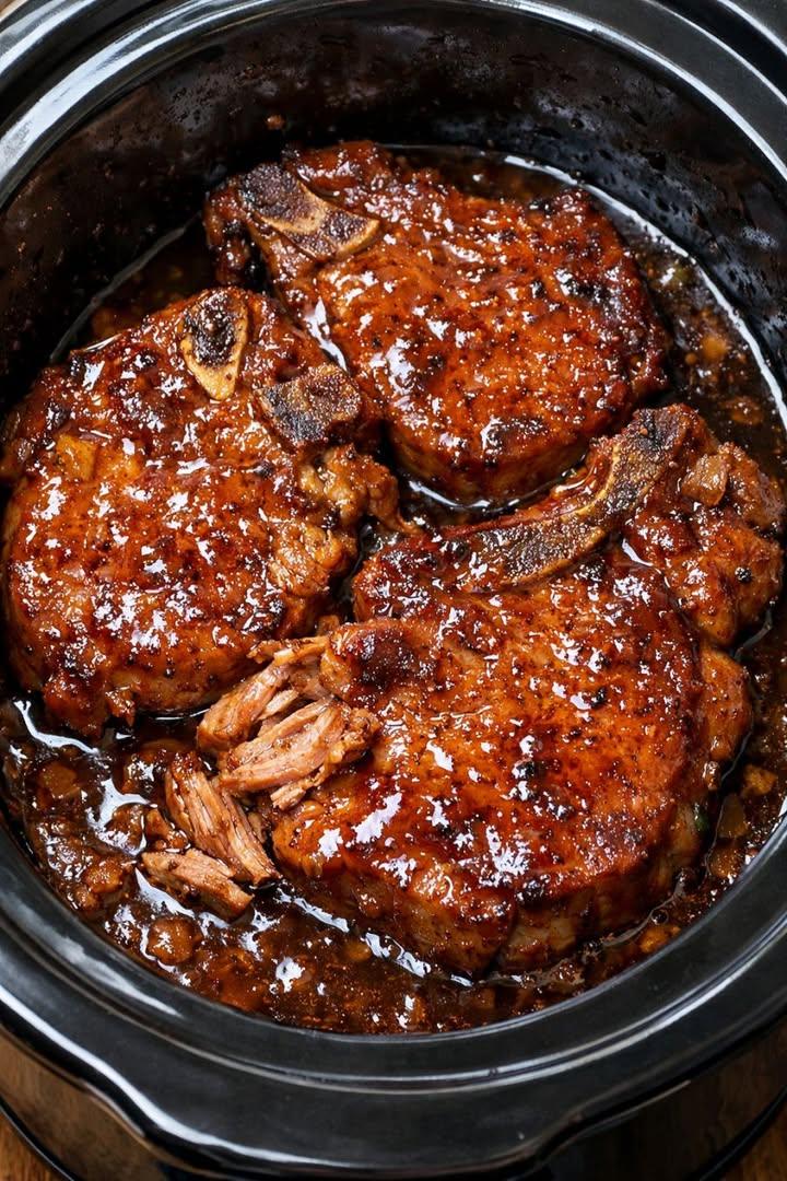 Slow cooker pork chops glazed with brown sugar sauce